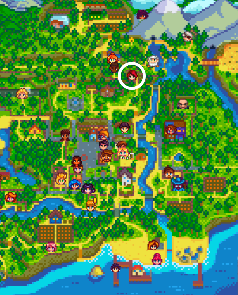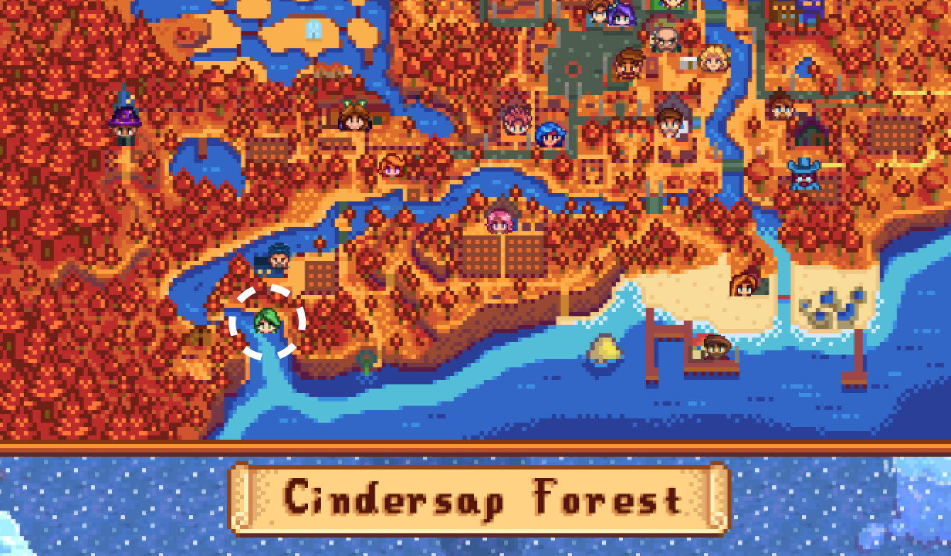 In the Cindersap Forest. South of Fairhaven Farm, which is southwest of Marnie’s Ranch.