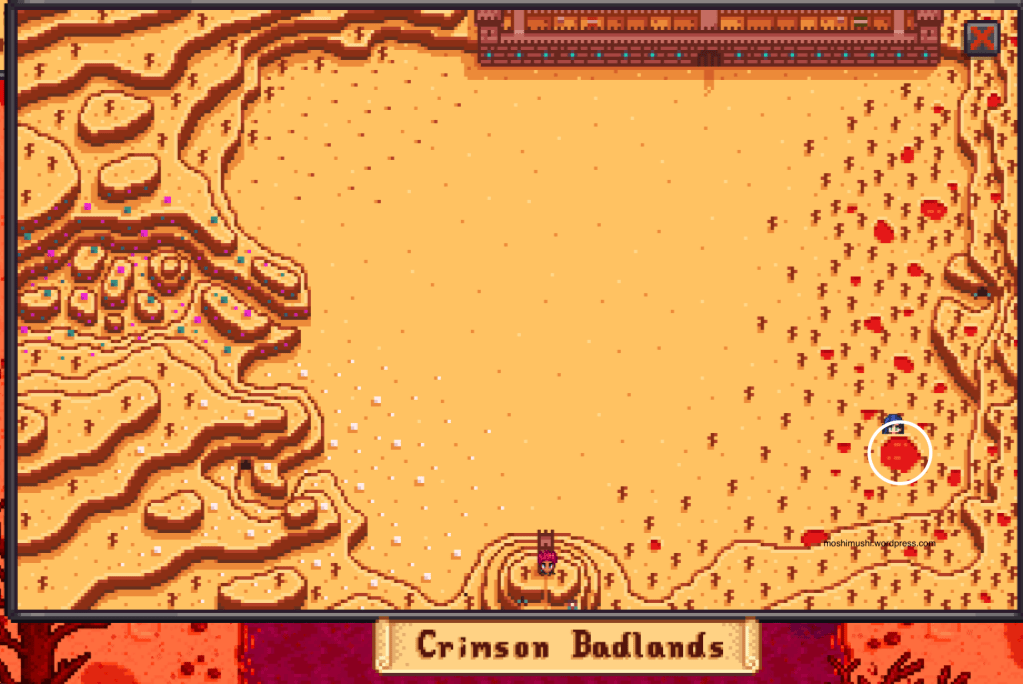 In vanilla, the entrance is northwest of the Desert Trader in the Calico Desert. In SVE, it’s to the south. Head south while hugging the rocky area south of the Desert Trader. You should pass by the cat statue. The cavern entrance is to the statue’s southeast. Continue hugging the rocky area while heading south from the statue and turn east where it ends.